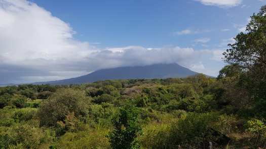 Foto 11: Een eindje verder naar het zuiden kreeg ik een goed uitzicht op de andere vulkaan: Volcan Maderas. Helaas had ook die een grijze pet op.Bij beide vulkanen mocht je vergezeld van een gids naar boven lopen, maar die grijze petten hadden mij de lust daartoe al ontnomen. Een paar uur omhoog sjokken, dan in een vette koude mist terecht komen met een uitzicht van niet meer dan drie meter en daar nog flink wat Cordobas voor neertellen, leek me meer iets voor de echte liefhebber. Geen vulkanen dus. En geen stranden voor mij, want ik ben geen plonzer. En veel meer was er niet te beleven.