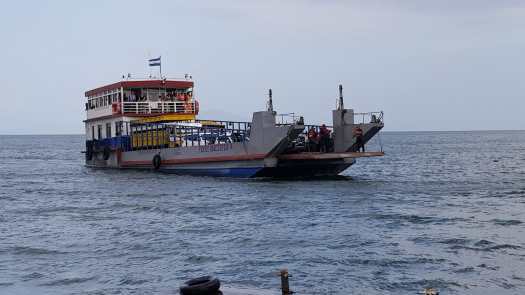 Foto 12: De ferryboot waarop ik op de derde dag van deze maritieme expeditie terug voer naar San Jorge. En weer hield mijn maag het.Een groter succes dan mijn tocht naar en over Isla Ometepe was mijn bezoek aan de stad Diriamba, 69 km naar het noorden. Daar werd het feest ter ere van San Sebastian, de beschermheilige van de stad, afgesloten met folkloristische dansen. De dansers waren gemaskerd en in kleurige kledij gestoken.