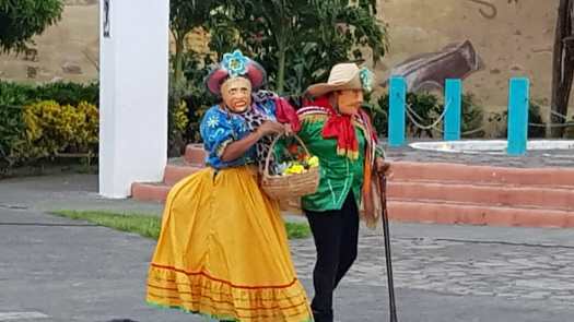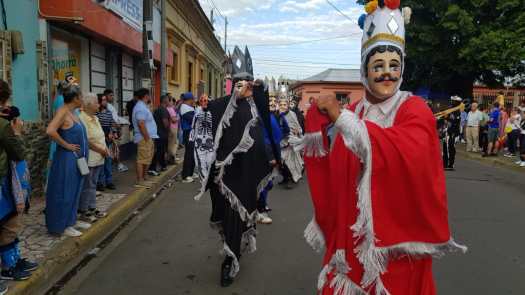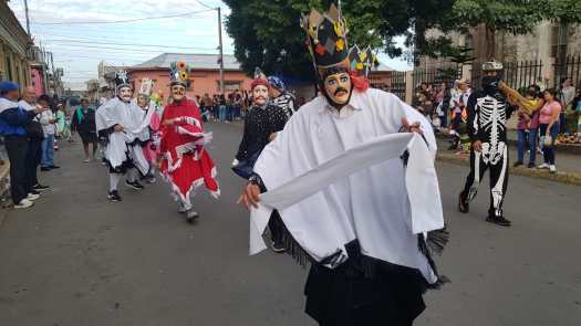 Het was overigens toeval dat ik tussen die festiviteiten terecht kwam. In Jinotepe, de plaats er 5 km voor, vertelde iemand mij dat er feest werd gevierd in Diriamba. Voor mij is feest meestal geen feest: drukte, lawaai, opstoppingen en luide muziek die zelden mooi is. Ik besloot dus om maar in Jinotepe te blijven maar kon daar geen goede overnachtingsplek vinden. Daarom reed ik toch maar door naar Diriamba. Voor de aan San Sebastian gewijde kathedraal, aldaar, bevond zich een grote menigte met daar tussen verschillende groepen dansers.