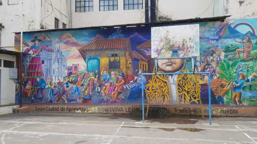 Foto 5: En ook Iglesia del Calvario was een bezoek en een aantal foto’s waard, waarvan hier één. Foto 6: Een fraaie muurschildering die een stuk geschiedenis van Nicaragua weergeeft. Ook heel prominent is hierop de zeer vereerde dichter Ruben Darío afgebeeld. Alleen jammer dat de plaatselijke basketbalvereniging er een groot basketdoel pal voor heeft gezet. We zien hier alleen de kin en het jasje van de grote dichter.