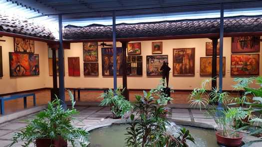 Foto (filmpje) 9: Een jongetje voor de kathedraal van Leon dat de vele duiven die op gestrooide broodkruimeltjes zijn afgekomen, probeert te verjagen. Hoogstwaarschijnlijk heeft hij nooit de film ‘The Birds’ van Hitchcock gezien.Er moest ook weer eens gewerkt worden aan het culturele peil van deze reis en een bezoek aan het Centro de Arte, de kunstgalerij van Leon, leek mij in dat verband een goede besteding van de middag. Het Centro bestaat uit twee delen, beide ondergebracht in mooie oude koloniale gebouwen in de Avenida 3 Poniente. Aan de westkant van deze straat is de moderne kunst te bewonderen, althans als je daarvan houdt. Ik bewonder die kunst doorgaans minder dan dat ik me er over verwonder.