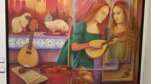 Foto 11: Toch nog wat aardigs gevonden bij die modernen. Een musicerende dame die in de spiegel kijkt. Haar spiegelbeeld heeft blijkbaar geen zin meer in dat getokkel, heeft de mandoline bij de katten gezet en heeft tegen haar origineel gezegd: ” Doe het zelf maar.” Of begrijp ik er weer eens niets van?
