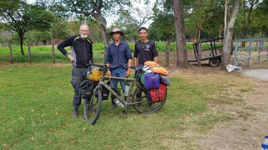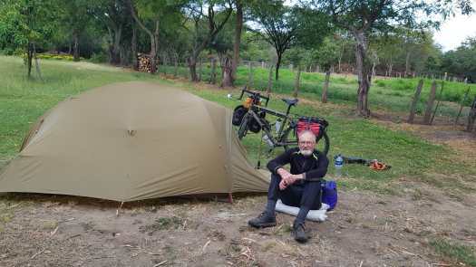 Foto 18: Maar dit, twee dagen later bij een rancho, enkele kilometers voor het stadje Sebaco, was geen klucht, maar harde realiteit. Het lijkt zo’n prachtig plekje, hoewel je soortgelijke plaatjes ook wel in de Achterhoek of op de Veluwe kunt schieten. Het wás ook wel een prachtig plekje, maar dat vonden de honderd miljard muggen die daar rond dansten ook, vooral toen ik er mijn tent opzette. Ik maak hier nog een redelijk ontspannen indruk terwijl ik poseer, maar met al die zoemstekers om me heen hield ik dat juist lang genoeg vol om deze foto van mij te laten maken.