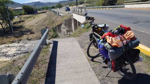 Foto 21: Een mooi betonnen fietspad langs de weg van Sebaco naar Matagalpa. Slechts één schoonheidsfoutje: bij een brug over een beek ontbreekt het fietsbruggetje. Ook geen bordje of hekje, dus de argeloze fietser tuimelt daar bij nacht 10 meter naar beneden in de beek. Maar aan de overkant loopt het fraaie fietspad wel weer gewoon door.