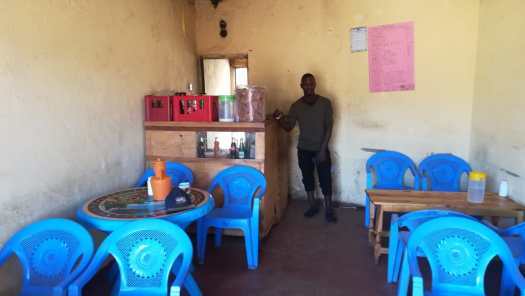 Foto 2 : Mister Tinga in zijn etablissement. De grote ronde plastic doos zit vol met zelfgebakken koeken, waarvan ik er een paar als additioneel ontbijt nam.