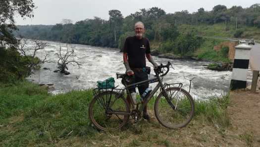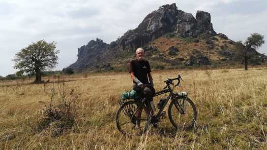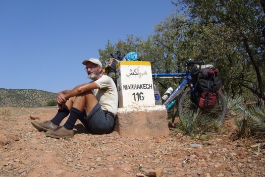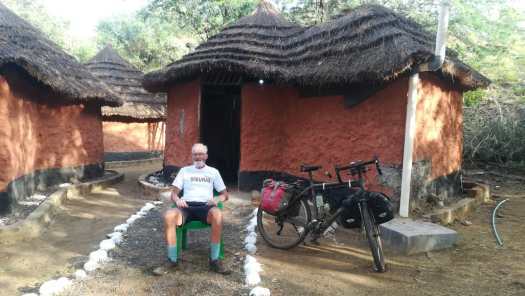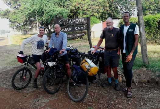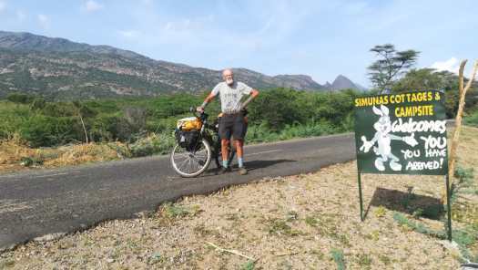 Foto 1: Bijna een halve eeuw na die ontmoeting stond ik met mijn zoveelste fiets, nu een Santos, voor het restaurantje van die Keniaanse naamgenoot van mijn vriend. Die ‘handsokken’ om mijn polsen heb ik niet aangetrokken om stoer te lijken maar om mijn handen en armen te beschermen tegen teveel zonnestralen.