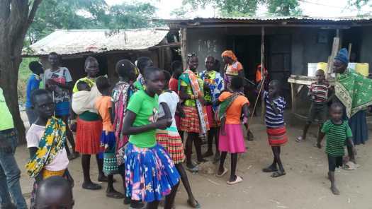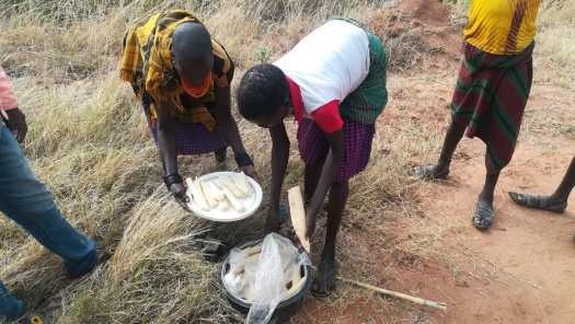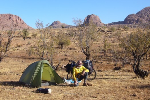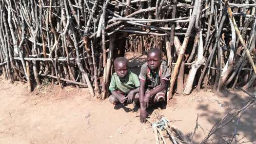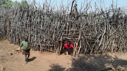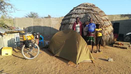 Foto 10: ’s Avonds kon ik mijn tent opzetten naast een woning, meer een hut, in het dorpje Lorogumu.De derde dag van deze doorsteek was weer zo’n dag waar een mens geweldig van kan genieten, althans na afloop. Tijdens het moeizaam en langdurig omhoog duwen van mijn eigenlijk veel te zwaar beladen fiets over een onmogelijk steile gravelweg, die in een paar slingers dwars over een bergketen voerde, kwam het niet bij me op om te gaan genieten. Er moest geduwd, getrokken en gehesen worden, anders zou ik nooit over die top komen. Over de 24,7 km van deze etappe, waar geen einde aan leek te komen, deed ik de hele dag. Ik hoopte onderweg een paar kinderen te ontmoeten, die ik voor een paar Keniaanse shillingen de fiets omhoog kon laten……