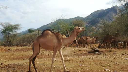 Foto 2: Onderweg zag ik een kudde grazende kamelen. Na 17 km kwam ik bij een slagboom waar een politieman de wacht hield. Hij kwam met een schriftje naar me toe en vroeg naar mijn paspoort om mijn gegevens te noteren. Ik gaf hem een copie.