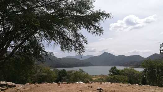 Foto 5: De eerste blik op het stuwmeer van de Turkwel River.Over een zijweggetje en langs een slagboom kon ik naar de dam rijden, maar fotograferen vanaf de dam was verboden. Helaas was dat de enige plek vanwaar je de Turkwel Gorge kon zien. Ik zag de kloof dus wel, maar omdat ik daar niet mocht fotograferen ziet u hem niet. Daarom was deze uitstap slechts een gedeeltelijk succes. Als u de Gorge wilt zien zult u er zelf heen moeten fietsen, hoewel… sommige mensen zijn zo bedreven met internet dat ze dat soort bezienswaardigheden kunnen zien zonder uit hun stoel te komen. Het is allicht te proberen!