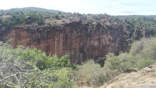 Foto 6: Een surrogaat plaatje. De rotswand van de Gorge. Door het dichte, doornige struikgewas kon ik niet aan de rand van de kloof komen en er dus ook niet in fotograferen.