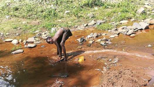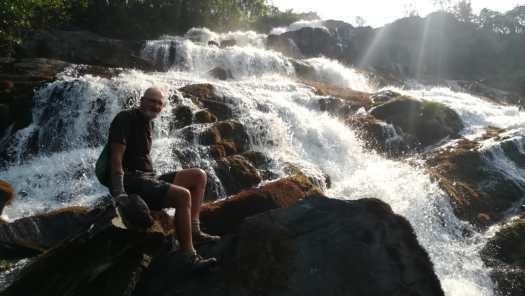 Foto 8: Benson bij een beek ergens in de rimboe.In de beek waren goudzoekers druk bezig in een poging om schatrijk te worden.