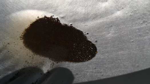 Foto 10: Beet! Kijk maar in de pan: een ‘klomp’ goud zo groot als een halve speldepunt. Dat kleine glimmende puntje geheel rechts in het residu. Daar kon hij vast wel een flesje limonade voor kopen.