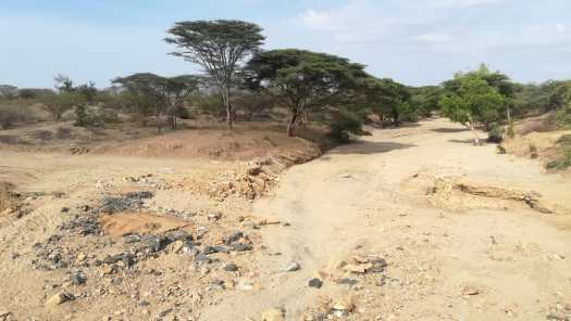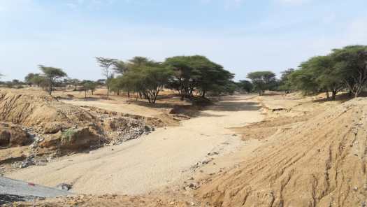 Foto 20: Nog zo’n oude wadi passage, gefotografeerd vanaf de nieuwe asfaltweg, die er naast ligt. Maar niet alles ging even gladjes, want ’s middags stak de wind op en die kreeg ik tegen. Tegenwind in de woestijn, waar niets staat om hem te stoppen, is een grote vijand van de fietser. Nogal afgebeuld kwam ik laat in de middag aan in Lodwar. Het bleek dat daar een forse bui was gevallen, waar ik onderweg slechts een paar spatjes van had gekregen.