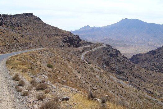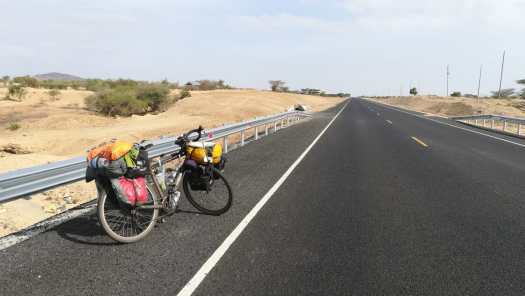 Foto 19: De nieuwe asfaltweg parallel aan de oude gravel weg. Nu peddelde ik gladjes over al die wadi’s heen waar ik de vorige keer steeds omlaag moest rijden, om vervolgens mijn fiets door de zandige bedding heen te duwen. En dan weer omhoog, de wadi uit.