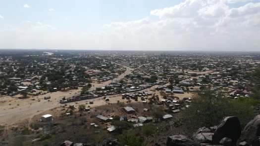 Foto 22: Lodwar dat in mijn herinnering, evenals Kitale, een dorp was toen ik er in1982 door fietste, bleek een vrij forse stad te zijn geworden. Hier een uitzicht over Lodwar vanaf een 100 meter hoge vulcanische heuvel. Ik klauterde daar met Joseph, een man die ik toevallig ontmoette en die hier in de omgeving missiewerk deed, naar toe.