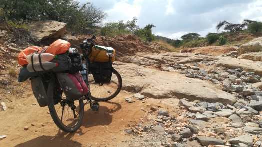 Foto 6: Hier klom ik een droge rivierbedding uit, waardoor ik weer stevige grond onder de wielen kreeg. Het was wel een erg stenige stevige ondergrond.