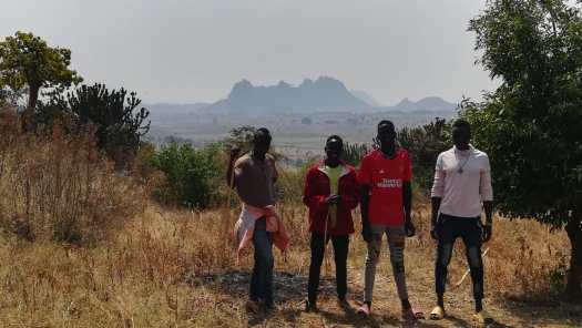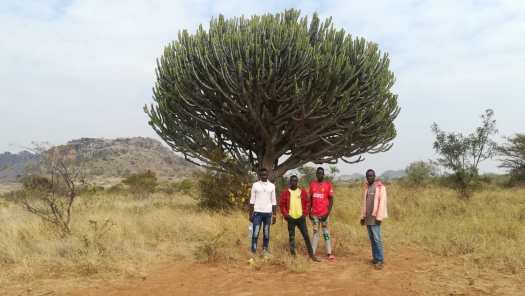 Foto 13: Voor het guesthouse Kara Tunga van Theo Vos. Van links naar rechts: Marc, Fred, ikzelf en Theo.Na twee dagen rust gingen Marc en Fred weer verder met hun reis en ik ook. We reden 30 km met z’n drieën, waarna Marc en Fred afsloegen naar het westen, richting Gulu. Ikzelf vervolgde mijn reis in noordelijke richting door het gebied van de Karamoja’s. Dat stond tot nog niet zo lang geleden te boek als een gevaarlijk gebied. De Karamoja’s waren beruchte veedieven. Ze stalen vee van elkaar, niet alleen om op een goedkope manier aan koeien te komen, maar ook omdat je daar aanzien mee verwierf. Hoe meer vee een man had gestolen, hoe belangrijker hij was. Het verhaal gaat, dat een man die nooit een koe had gestolen geen knip voor zijn neus waard was en het wel kon vergeten om ooit een vrouw te vinden. De laatste jaren is de veiligheid in dit gebied flink toegenomen en wordt het als veilig gezien. Voor mij was het nog eens extra veilig want ik heb nog nooit een koe, een schaap, een geit of een kameel gestolen. Zelfs geen kat! Het idee geen knip voor mijn neus waard te zijn gaf me op de verlaten wegen naar het hoge noorden van Uganda dan ook een rustig gevoel.
