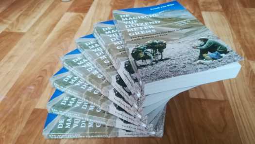 Foto 27: De herdruk van mijn boek ‘De magische vijfduizendmetergrens’, volledig in kleur, is ondertussen van de pers. Op zo’n manier gestapeld zag ik eens een boek bij de kassa van een boekhandel liggen, helaas niet mijn boek. Zo’n winkelier weet natuurlijk precies hoe het moet. Vandaar deze immitatie.Hopelijk tot op de beurs.