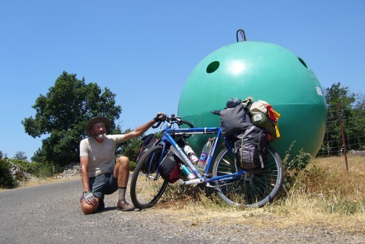 Foto 5: Een geografisch monumentje langs de weg in de vorm van de wereldbol, dat de plaats markeert vanwaar het even ver naar de evenaar als naar de Noordpool is, namelijk de vijfenveertigste breedtegraad (ergens halverwege Frankrijk). De evenaar is duidelijk aangegeven, evenals de Noordpool. De Zuidpool zit helaas verscholen achter mijn Schwalbe band. De plaats op aarde waar ik mij hier bevind is aangegeven met een rond gat. Het monumentje is multifunctioneel, want je kunt er ook oude flessen in kwijt.