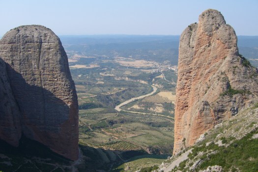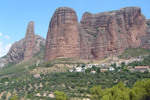 Foto 8: We zijn ondertussen al in Spanje. Hier ‘Los Mallos de Riglos’, overblijfselen van een geërodeerd plateau. Het dorpje Riglos geeft een indruk van de dimensies van die ‘Mallos’. Ik klauterde links op de foto tussen de twee reusachtige pilaren door omhoog naar het plateau.