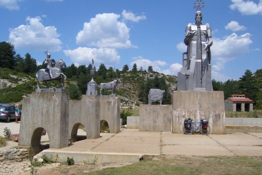 Foto 13: Het gigantische beeld dat de bron van de Taag markeert. Linksonder in de foto zou het eerste stroompje van de Taag moeten stromen, maar toen ik daar was, stond het droog. Met het veranderende klimaat zou het niet onmogelijk zijn dat het beeld nu met zijn voeten in het water staat. Dan zou zelfs mijn fiets onder water staan, maar dan had ik hem er natuurlijk niet neergezet.