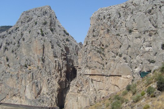 Foto 24: De Garganta del Chorro, ca. 40 km ten Noordwesten van Malaga. In die tijd was de Camino del Rey, het hangende vlonderpaadje langs de rotswand in de kloof, nog niet gerestaureerd. In het midden de voetbrug over de kloof. Het groene rechts: een spoorbrug over een zijkloof op het spoortraject van Malaga naar Bobadilla