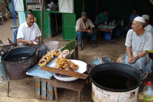 Foto 40: Olieringenbakkers in Ouzoud. Hier dus ringen in plaats van bollen. Dik met suiker bestrooid smaken die bijzonder goed en door de olie blijft de suiker beter plakken.