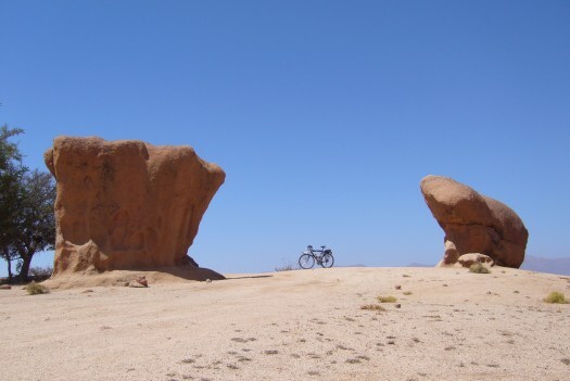 Foto 58: Twee verdwaalde rotsen met mijn fiets er tussenin.