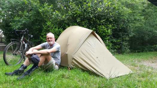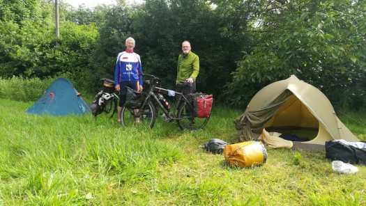 Foto 9: Kamperen bij de boer. Links gele Jan die blauw is geworden en rechts rode Frank die groen is geworden.De dag hierna ging Jan terug naar huis. Zijn plichten riepen hem: getrouwd, kinderen en kleinkinderen. En hij moest stemmen (6 juni) voor een beter Europa en had daar helaas niemand volmacht voor gegeven. Dat had ik wel dus ik kon mijn reis vervolgen.