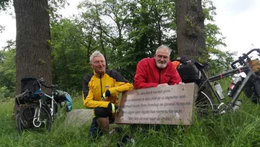 Foto 3: Jan links en ik rechts bij de plakkette die de ontmoeting tussen Gérard Monnink en Toon Damhuis markeert. Tussen Jan en zijn fiets is nog juist de steen te zien waarop ‘Toon Damhuis’ staat gegraveerd. Rechts van mijn fiets staat de steen met ‘Gérard Monnink’ maar die valt buiten beeld.