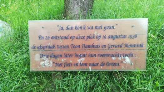 We fietsten een kilometer of twee in de richting van Oldenzaal en vonden de plakette die de ontmoetingsplaats tussen deze twee vooroorlogse globetrotters markeert.