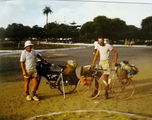 Foto 16: Eerste ontmoeting met Heinz Stűcke. Boa Vista, Brazilië. 1985. Links Heinz. Let op de wereldkaart in het frame van zijn fiets. Daar stonden al zijn wereldreizen ingetekend. Rechts ik, wat jaartjes jonger dan nu. 39 jaartjes om precies te zijn. Deze foto komt uit mijn boek ‘Revanche in de Andes’ waarin ik die ontmoeting heb beschreven. Voor dit boek hoeft u geen kringloopwinkels af te stropen. Het is nog te bestellen bij uitgeverij Elmar of bij uw boekhandel. De kwaliteit van deze foto is zo beroerd omdat ik een foto heb gemaakt uit mijn boek en natuurlijk omdat de foto (oorspronkelijk dia) bijna 40 jaar oud is. Een historisch document, dus.Na deze eerste ontmoeting heb ik Heinz tot 6 juni j.l. nooit meer ontmoet. Wel ben ik eens bij hem aan de deur in Hövelhof geweest maar toen was hij uiteraard niet thuis en hij is ook eens bij mij aan de deur geweest en toen was ik, wat minder uiteraard, maar toch wel een beetje uiteraard, ook niet thuis.