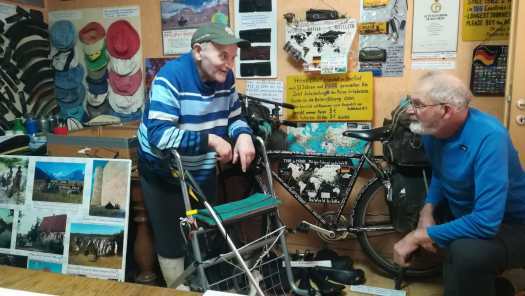 Foto 17: Tweede ontmoeting met Heinz Stücke, Hövelhof, Duitsland, 6 juni 2024. Heinz links, ik rechts. Tussen ons in staat zijn originele fiets met nog steeds die wereldkaart in het frame. Verder links stukken van versleten banden en versleten hoeden. Hij stuurde veel versleten materiaal op maar familie in Duitsland met de bedoeling daar te zijner tijd een museum mee in te richten.