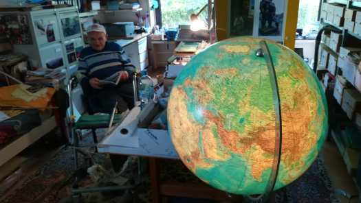 Foto 18: Heinz achter zijn wereldbol in zijn werkkamer. Hij heeft tegenwoordig wat problemen met zijn benen, dus fietsreizen zitten er op zijn 84ste jaar niet meer in. Met 648.000 fiets kilometers is hij, bij mijn weten, de ‘Most traveled man in history’, zoals hij zichzelf eens op een gedrukte anzichtkaart noemde. “You are invited to prove me wrong”, schreef hij er bij. Ik lig nog zo’n 13.000 km achter hem maar fiets nog steeds. De toekomst zal leren of ik hem daarin voorbij ga, maar als dat zo zou zijn, blijft hij toch die meest bereisde man uit de geschiedenis, want hij is bijna 60 jaar onderweg geweest en is in alle landen van de wereld geweest. Daar blijf ik dan met mijn 125 landen en Ameland als het meest noordelijke punt waar ik ooit geweest ben, een eind bij achter.