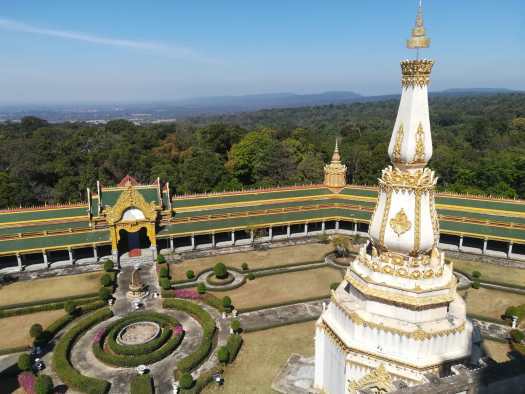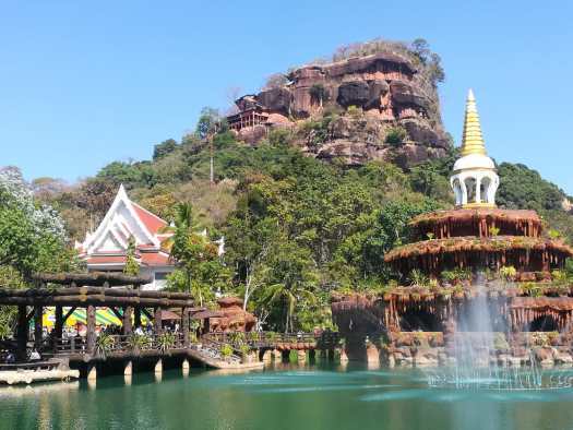 Foto 1: Wat Phu Thok met een tempel er voor.Je kon via steile houten trappen omhoog naar de top. Er zijn zes niveaus en op de meeste daarvan kun je over vlondertjes, die tegen de rotswand getimmerd zitten, rond deze markante rotsberg lopen.