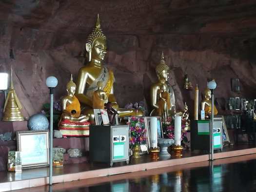 Na die regendag was het nog steeds zwaar bewolkt, maar het was gelukkig droog. Ik besloot om een ritje zonder bagage te gaan maken naar Tham Pa Fa, een in 2004 bij toeval ontdekte Boeddha grot, een kilometer of 10 ten oosten van Tha Khek. Een boer klauterde dat jaar een meter of 15 omhoog langs een 200 meter hoge Karstberg, waaruit hij ’s avonds een zwerm vleermuizen had zien wegvliegen. “Dat wordt een maaltje vleermuizen soep”, zal hij likkebaardend gedacht hebben. Hij ontdekte daar een grot met smalle opening. Toen hij naar binnen klauterde om een zak te vullen met vleermuizen voor zijn soep, vond hij echter 229 Boeddhabeelden variërend in grootte van 15 cm tot een meter. De meeste waren van brons maar er zaten ook 16 beelden van puur goud bij. De man moest weerstand bieden aan de verleiding de beelden een voor een te gaan verkopen, maar uiteindelijk besloot hij toch deze vondst te melden, wat hem de held van de wijde omgeving maakte omdat de grot een pelgrimsplaats en een toeristische bezienswaardigheid werd. De beelden werden door experts op 300 tot 600 jaar oud geschat, vermoedelijk door de toenmalige eigenaar daar verstopt om later, als de kust veilig was, weer op te halen. Dat laatste is dus nooit gebeurd. Gelukkig zou je moeten zeggen anders had onze klauteraar alleen vleermuizen voor zijn soep gevonden en waren de beelden verdwenen. Wel triest voor die 600 jaar oude eigenaar, maar die zou daar nu toch niets meer aan hebben.