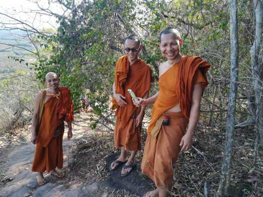 Foto 11: Drie wél echte monniken, zelf met een mobiele telefoon.Een kilometer of 15 naar het oosten moest een mooie waterval te bewonderen zijn en dus fietste ik daar heen. De laatste 1,5 km moest ik lopen, waarbij ik over een interessante rotsbodem met boeiende watererosiepatronen kwam.