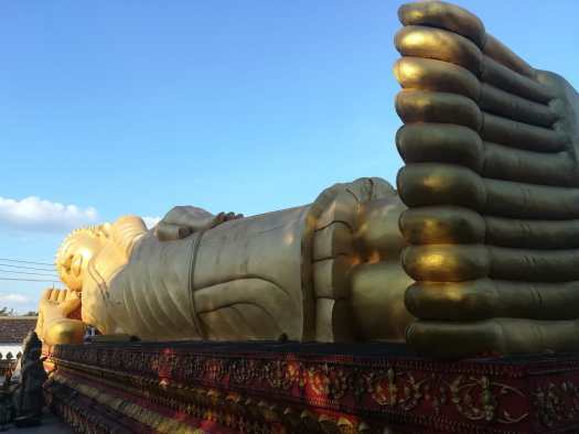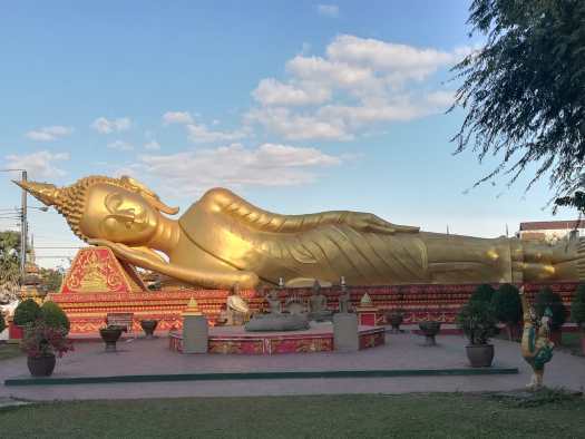 Vlakbij de Tad Luang staat een groot beeld van een liggende Boeddha. (Een beeld staat altijd, ook al ligt het onderwerp, want als een beeld toch zou liggen, moet het overeind gezet worden wat in dit geval als consequentie zou hebben dat Boeddha niet meer ligt, wat wel de bedoeling was van de kunstenaar.