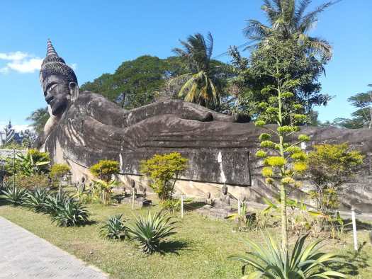 Een kilometer of 20 buiten Vientiane, op weg naar een prachtig karstgebergte in midden Laos, zag ik in een aardig beeldenpark weer een liggende Boeddha.