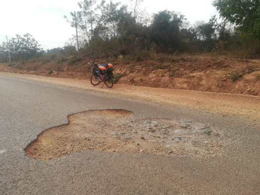 Wat voor automobilisten en zeker voor vrachtwagenchauffeurs de grootste obstakels vormden, waren de potholes (gaten) in de oude weggedeelten. Als fietser kun je daar meestal makkelijk omheen rijden, terwijl er doorheen denderen, als je een stevige fiets hebt zoals ik, ook zijn charme heeft.