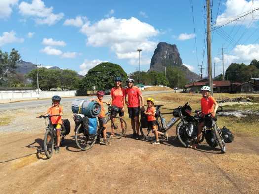 Foto 13: Een Franse familie met de fiets op wereldreis.Ik vond het op deze weg, de grote weg van Thailand via Laos naar Vietnam, een nogal hachelijke onderneming om vier minderjarige kinderen te laten fietsen, maar de beide ouders waren er nogal laconiek over: “We hebben allemaal een oranje shirt aan, dus we zijn duidelijk zichtbaar. Voor een naderende vrachtwagenchauffeur is dat een grote groep en dus iets bijzonders. Darom zal hij afremmen en aan de kant gaan. Als enkele fietser loop je veel meer risico.”