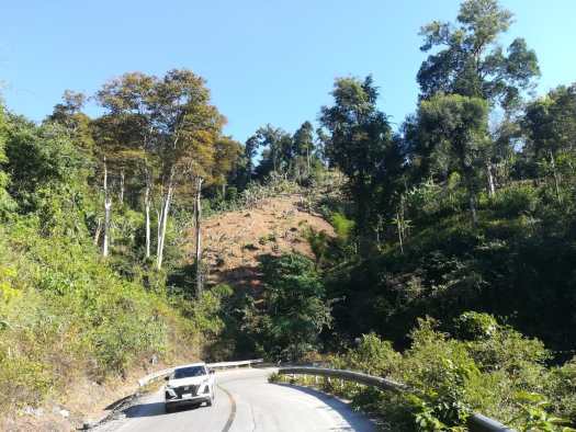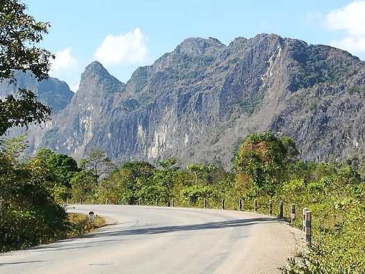 Foto 15: De weg met mooi decor en met links een oud Frans kilometerpaaltje. (Laos is vroeger een Franse colonie geweest.)
