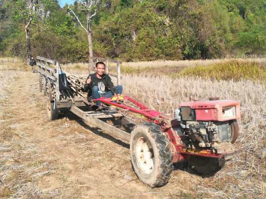 Foto 16: Een boer met een enorm veel lawaai producerend plof-plof tractortje.