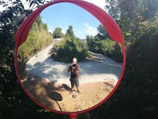 Foto 20: Artistieke foto genomen van een verkeerspiegel in een onoverzichtelijke bocht.Ik realiseer me dat, vooral in het begin van deze aflevering, de verhouding tussen tekst en plaatjes in het nadeel van de plaatjes uitvalt. In een poging om de plaatjeskijkers te vriend te houden besluit ik deze aflevering met een serie foto’s die ik schoot op een dagrit zonder bagage waarbij ik op goed geluk een aardig gravelweggetje in reed dat recht een nogal woest gebied in voerde.
