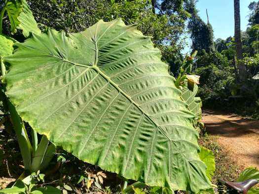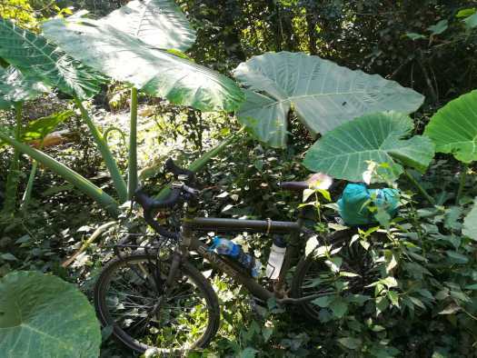 Foto 25: Ik kwam verderop door een tropisch woud. Mijn fiets onder planten met reuzen bladeren