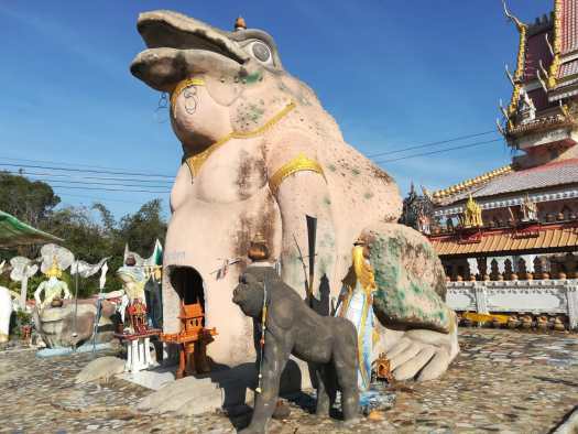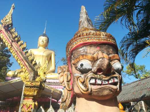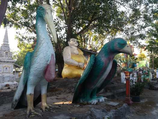 Foto 14: In de tuin van Wat Pa Non Sawan. Een dikke Boeddha achter twee vreemde vogels.