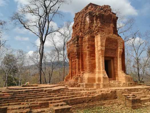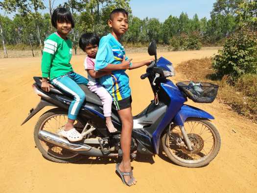 Foto 3: Jongetje met zijn twee zusjes op een bromfiets alsof het een stukje speelgoed is.Hier op het grensgebied van Cambodja zijn zo’n duizend jaar geleden flink wat Khmertempels neergezet. Toeristen die behoren tot de categorie ‘Als je er één gezien hebt, heb je ze allemaal gezien’, zijn hier snel klaar. Ik heb dat met moderne, abstracte schilderijen en ben in een museum van moderne kunst doorgaans in enkele minuten klaar. Op oude kunst en ook antieke tempels en gebouwen ben ik een stuk minder snel uitgekeken, vandaar dat ik een paar omwegen inlaste om toch maar zoveel mogelijk van dit soort fraaie oude monumenten te bekijken. Dat wil overigens niet zeggen dat ik een Khmer-kenner ben. Integendeel, maar ik vind het aangenaam om op mijn gemak tussen die oude gebouwen rond te lopen en in mijn fantasie de noeste bouwers van deze wonderen der architectuur bezig te zien terwijl ze zwoegend, zwetend en steunend al die stenen op elkaar stapelen.