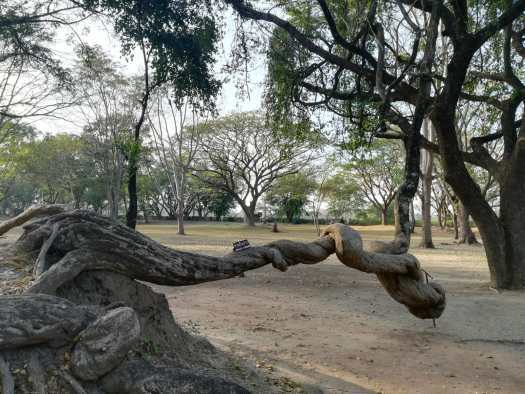 Foto 6: Op het terrein van deze tempel zag ik een merkwaardige boom, eigenlijk een parasiet, die zich met een bochtige tak, waar een soort ‘knoop’ in zat, naar een andere boom geslingerd had, om die het leven zuur te maken.