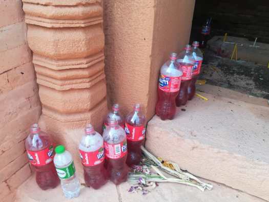 Foto 1: Vooraanzicht van de Kaho Lon tempel. Links in de hoek van de ingang zijn de Fanta-flessen te zien, die als offeranden dienen.Op de route naar Chantaburi, dat dicht bij de Golf van Thailand ligt, kwam ik langs een nieuwe, nog in aanbouw zijnde tempel waar een Boeddhabeeld op staat, dat er weer eens mag zijn. Zoals zo vaak met dat soort tempels heeft men hier niet moeilijk gedaan over een paar extra kubieke meters beton.