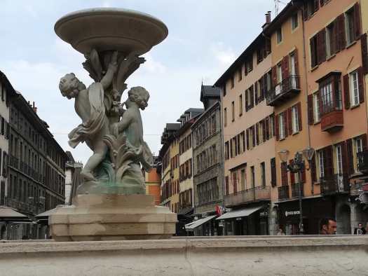 Foto 10: Het beroemde plein met de vier olifanten in het centrum van Chambéry. Een ex generaal van Napoleon maakte zijn fortuin in India en liet na zijn terugkomst in Chambéry de stad verfraaien met diverse gebouwen. Ook dit beeld, dat zo uit India lijkt te zijn weggelopen, liet hij plaatsen.